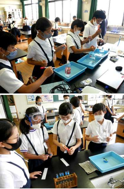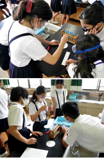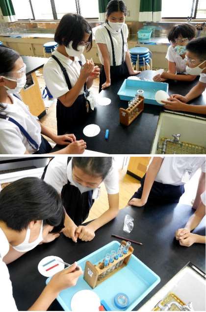 6年生の理科の実験です。食塩水、炭酸水、うすい塩酸、重そう、うすいアンモニア水を赤と青のリトマス紙につけて変化を調べています。班で協力してつぎつぎと段取りよく調べていきます。
