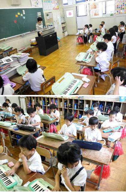 1年生では、鍵盤ハーモニカを使って音の勉強をしています。「ドレミフォソ」「ソファミレド」と皆でテンポをあわせて練習しています。テンポがなかなかそろいませんが、1音1音を楽しんで弾いてみましょう。