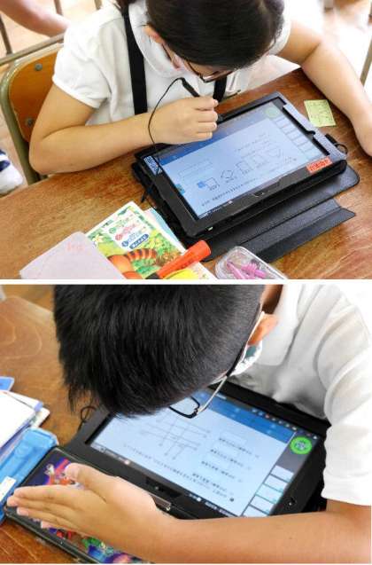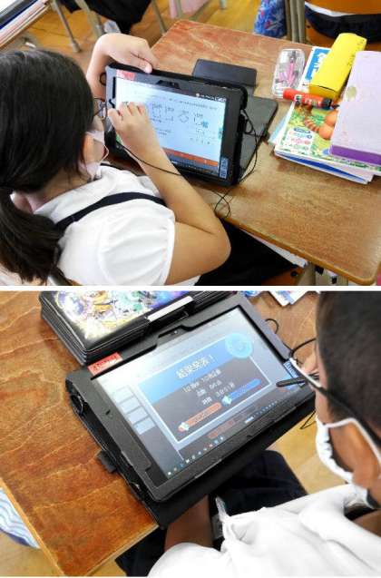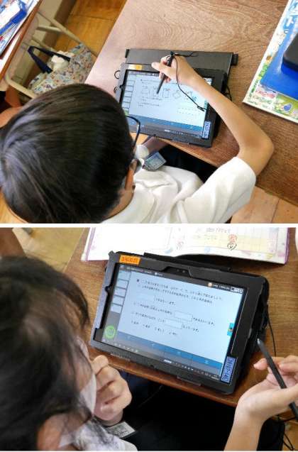 4年生がタブレットで勉強しています。タブレットで算数のドリルができます。自分で問題を解いてたしかめたりできます。まちがったところも何回もチャレンジできて、その学習の状況が記録されていきます。先生たちもそれぞれの学習の状況をパソコンで確認できるようになっています。子どもたちがつまづいているところを確認して指導の参考にしていきます。