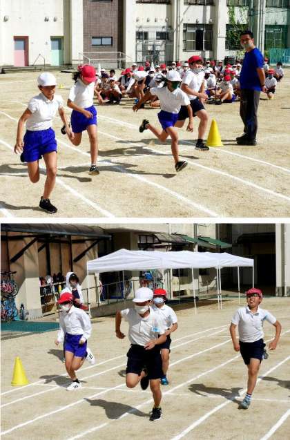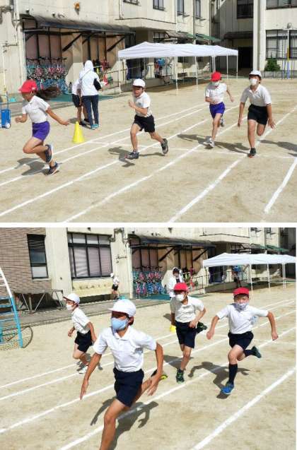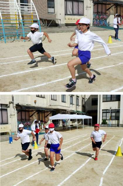 5年生が運動会の個人走の練習をしています。走るレーンを確認していました。