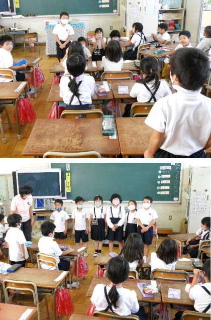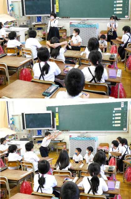 1年生の学級活動では、ジェスチャークイズを出して皆で答えていました。とても楽しそうですね。