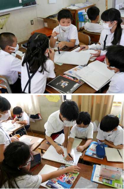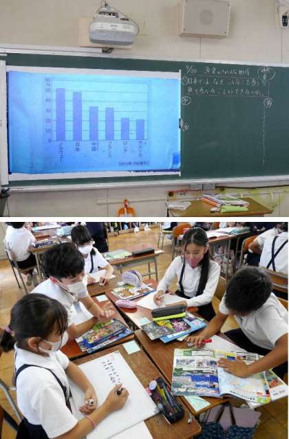 5年生がグループで話し合って、ホワイトボードにまとめています。「日本では、なぜ、こんなにも多くの魚を食べることができるのか」について話あっています。
