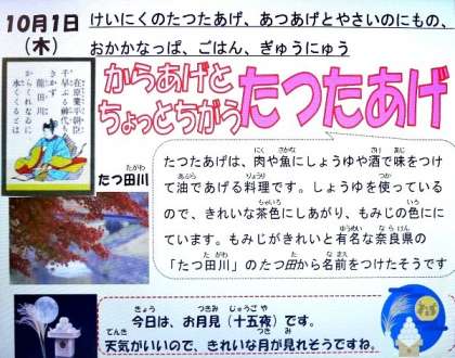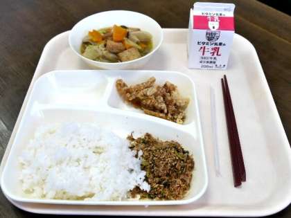 今日の献立は、鶏肉の竜田揚げ、厚揚げとやさいの煮物、おかかなっぱ、ごはん、牛乳でした。