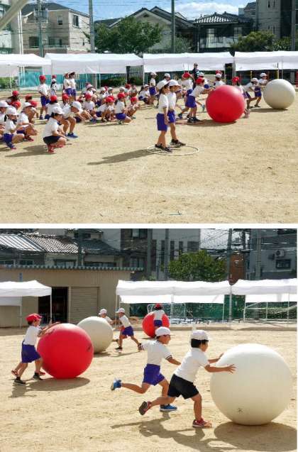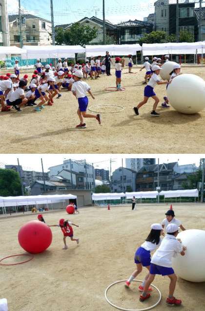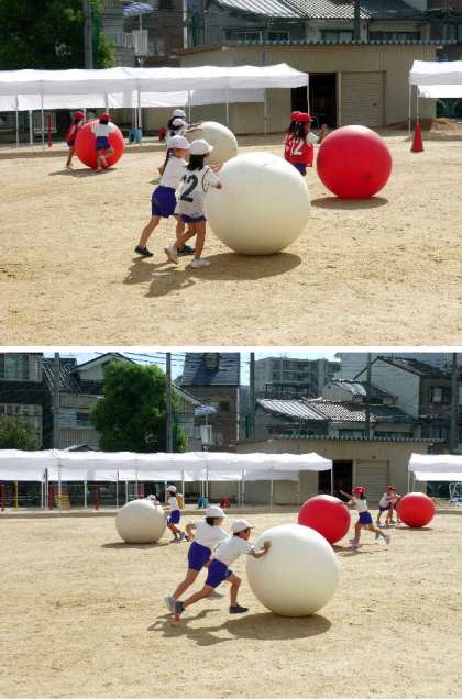 2年生の団体競技は大玉ころがしによるリレーです。今日はじめて、大玉を使っての練習です。二人で協力してころがしていきます。とても大きな玉なので、少しむずかしいけど、一生懸命にリレーをしました。