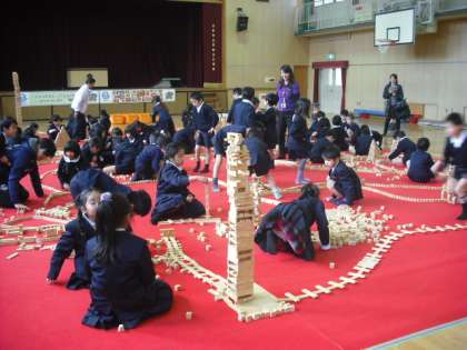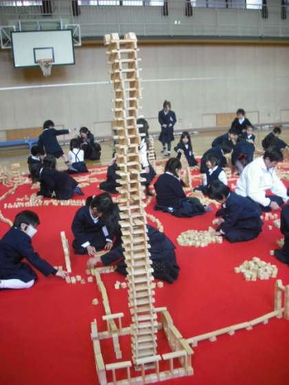 国際協力NGOオイスカの方に、たくさんの積み木を用意してもらい、1年生の子どもたちが 講堂で塔や家、線路など 自分たちの好きなものを思い思いにつくって楽しみました。