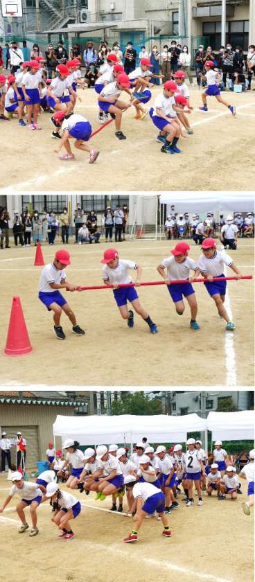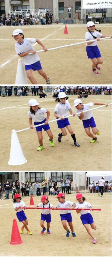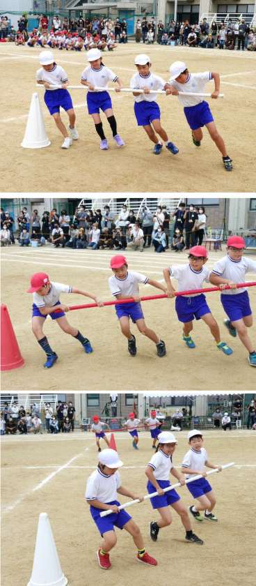 4年生の団体競技は「台風の目」です。棒をもって、くるっとコーンを回ります。もどってきたら、棒をみんなで跳び越えてバトンチェンジです。