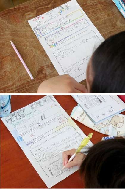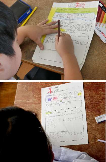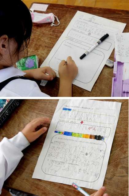 1年生が運動会を振り返り、がんばったことやできたこと、楽しかったことやうれしかったことを書きました。