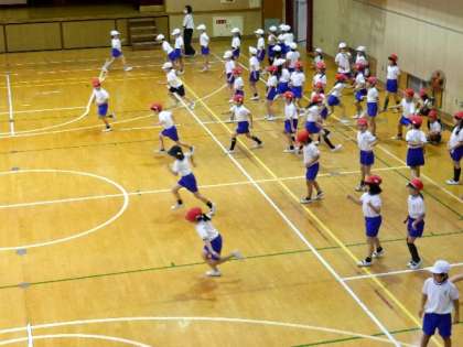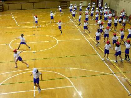 2年生が体育館で楽しく運動をしていました。スキップしながら走ったり、後ろ向きに走ったり、子どもたちの楽しそうな声が、体育館中に響いていました。