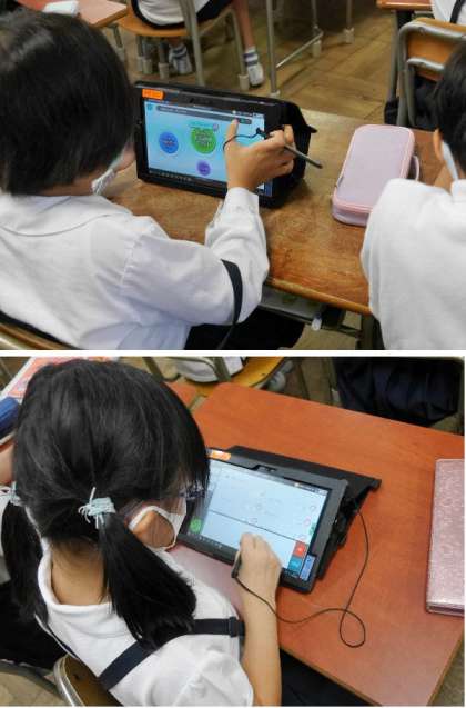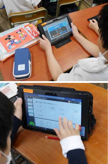 3年生では、タブレットを使って、算数のドリル問題をしています。自分のペースにあわせて学習できるのがいいですね。