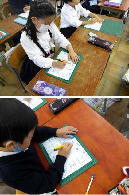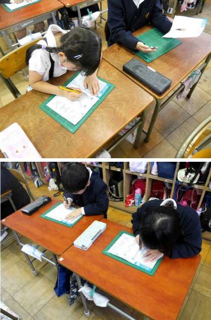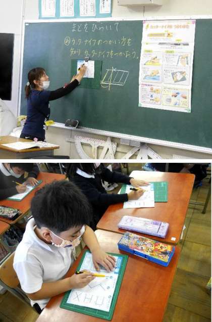 2年生では、カッターナイフで作業して作品などを作っていきます。そのために、カッターの使い方を教えてもらい練習しました。みんな慎重に作業をしています。