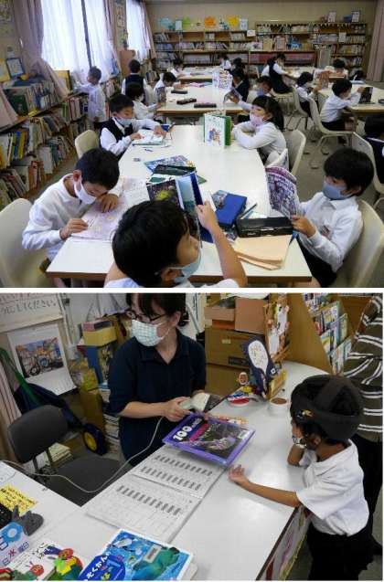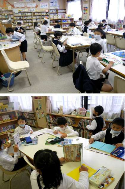1年生の図書の時間です。本を借りることができるので、みんな読みながら本を探しています。