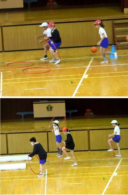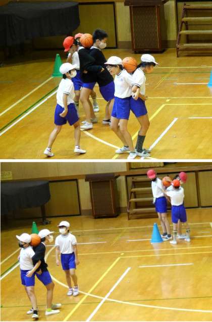 二つのチームに分かれて、ボールを使っての運動のリレーです。二人で協力しあって運動します。