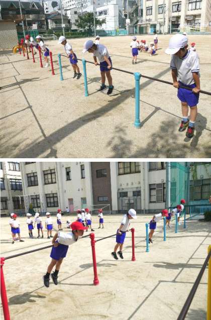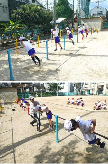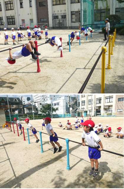 1年生が鉄棒を使っての運動をしています。鉄棒でつばめさんの姿勢をして、前回りをします。