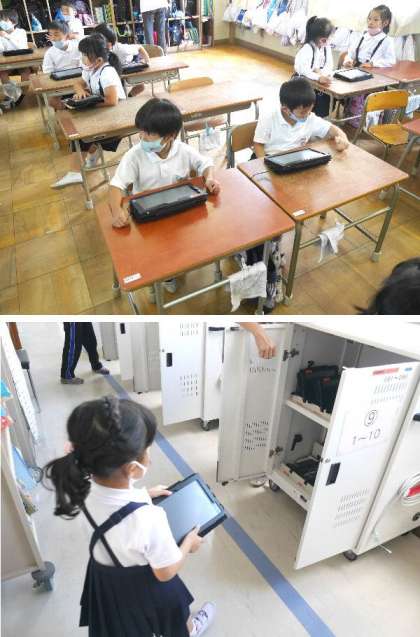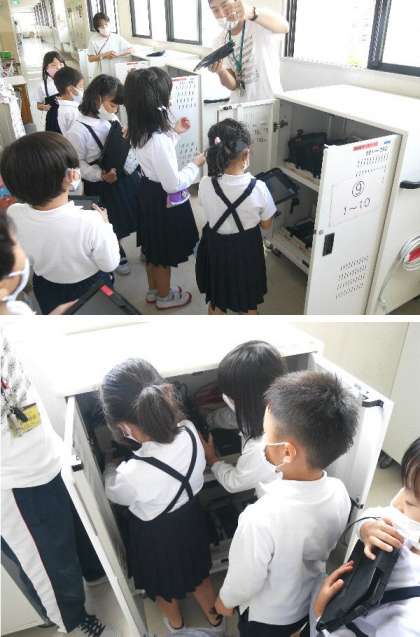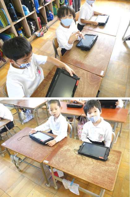 1年生がタブレットを取り出したり、直したり練習していました。これからタブレットも使っていく予定です。
