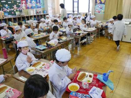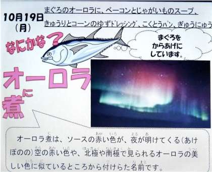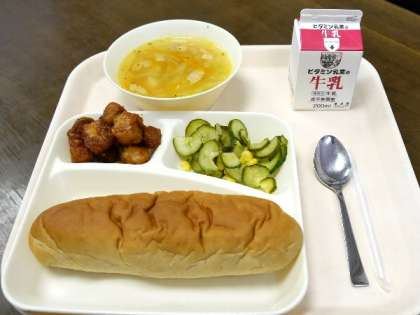 今日の献立は、まぐろのオーロラ煮、ベーコンとじゃがいものスープ、きゅうりとコーンのゆずドレッシング、黒糖パン、牛乳でした。