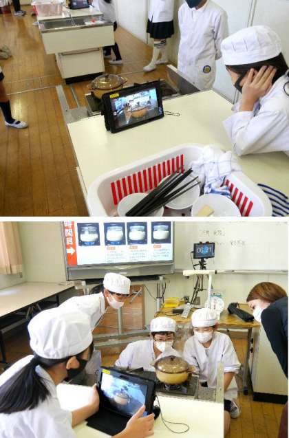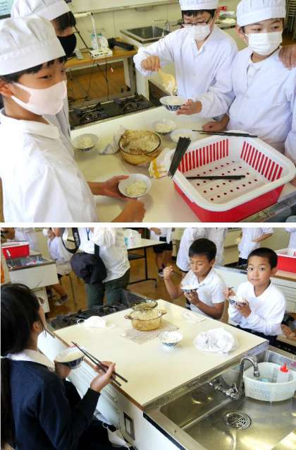5年生が家庭科室でご飯を炊く学習をしました。なべがガラスなので、ご飯の炊ける様子がよく見えます。タブレットで様子をビデオにとりました。炊けたご飯は皆で試食しました。炊きたてのご飯は格別においしいですね。