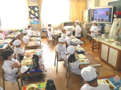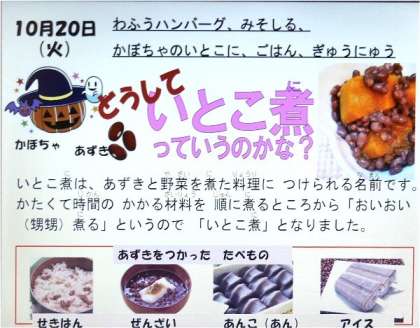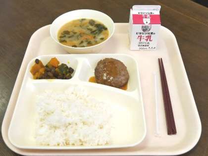 紀要の献立は、和風ハンバーグ、みそ汁、かぼちゃの従妹煮、ご飯、牛乳でした。今日もおいしくいただきました。