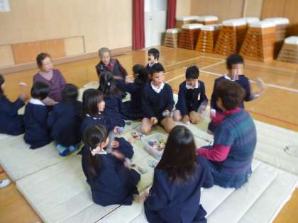 老人クラブの方々に昔遊びを教えてもらいました。こままわし だるま落とし お手玉などで遊びました。みんなとても楽しい時間を過ごしました。