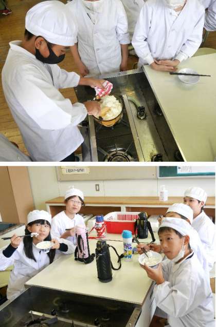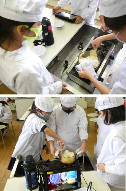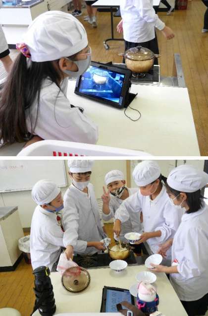 5年生の家庭科では、ごはんを炊く調理実習をしています。毎日のように食するご飯です。どうやってお米から炊けるのか、透明容器で炊ける様子を観察しながらの学習です。炊飯器でなくてもご飯は炊けるんですね。
