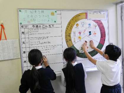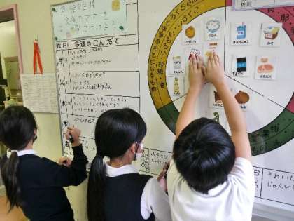 児童会の委員会活動で高学年ががんばっています。給食室では給食委員が、今週のこんだてを書いたり、栄養グラフを直していました。