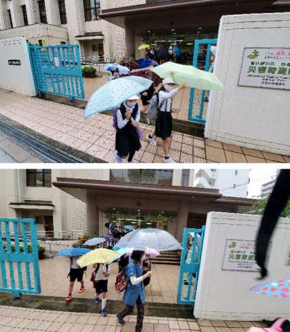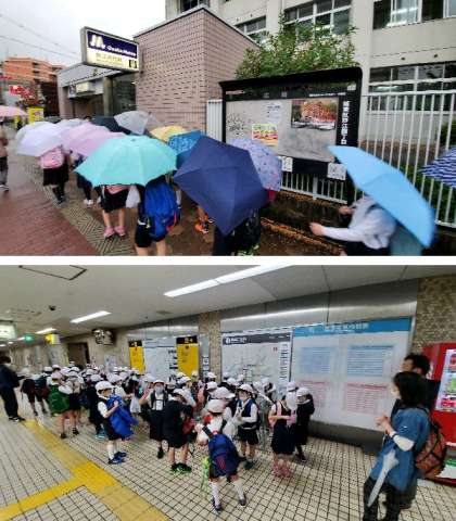4年生が校外学習で万博記念公園に出かけます。雨天ですが、9時過ぎて少し小降りになって来ました、