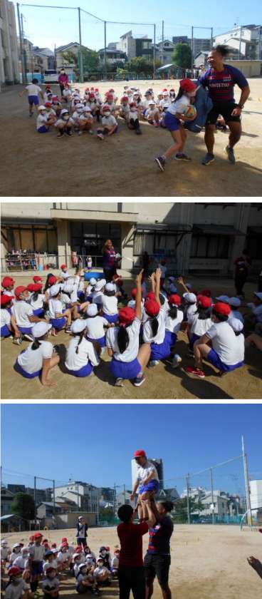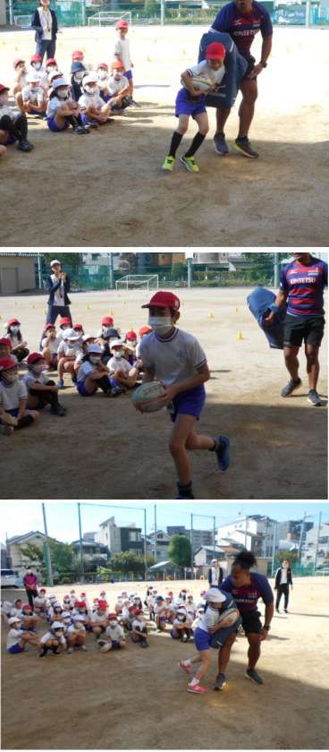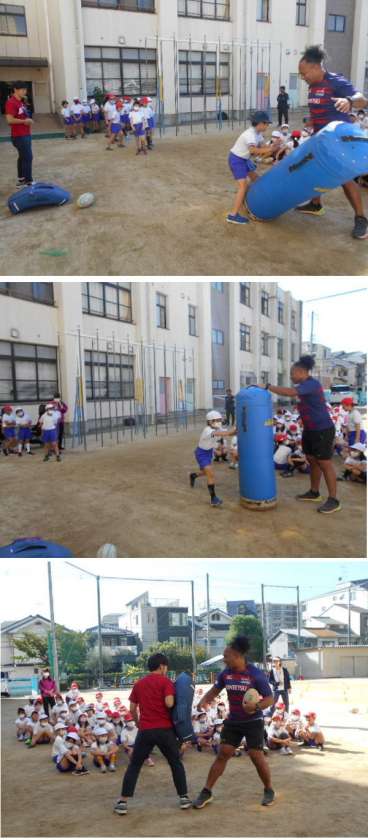 3年生で、トップアスリートによる出前授業が行われました。種目はラグビーです。はじめて手にするラグビーボールをパスしたり、タックルなどを教えてもらいました。