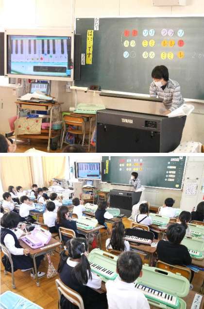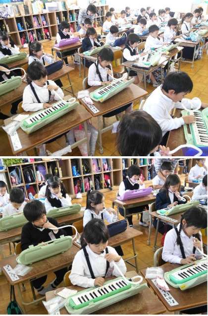 1年生が、鍵盤ハーモニカで音階をリズムよく、皆で弾いています。だいぶ上手になりましたね。