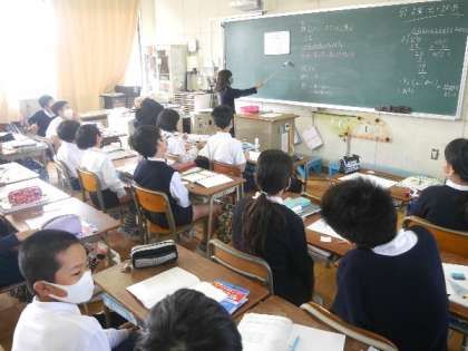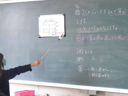 5年生の算数です。「2リットルのジュースを3人で等分します。一人分は何リットルになりますか」の問いに、どうやって計算するか、わり算の商の表し方を考えています。