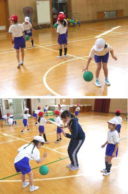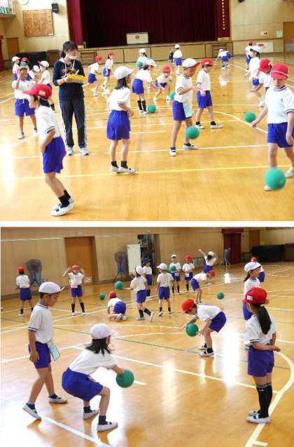 1年生はボールを上手に扱う練習をしています。小学校や中学校の体育では、ボールを使った競技などもどんどんしていきます。先生がひとりひとり確認をしています。