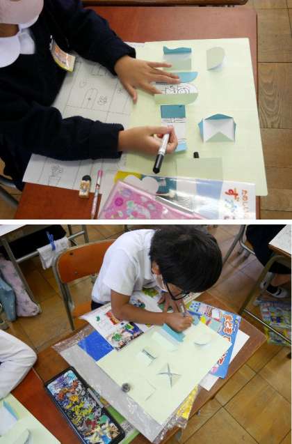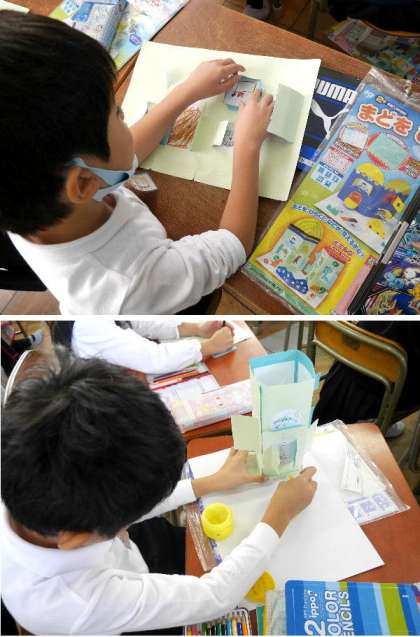 2年生が「まどをひらいて」を作っています。窓わくをあけたところに絵をかいて、タワーのようにくみたてて作っています。窓の中には何がみえるかな。