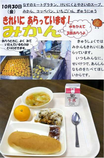 今日の献立は、なすのミートグラタン、鶏肉と野菜のスープ、みかん、コッペパン、いちごジャム、牛乳でした。