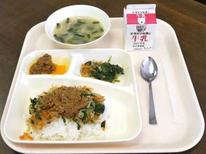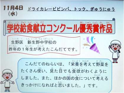 今日の献立は、ドライカレービビンバ、トック、牛乳でした。学校給食献立コンクール優秀賞の給食でした。