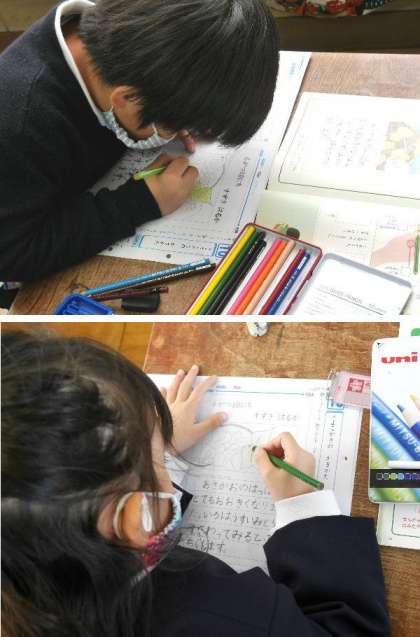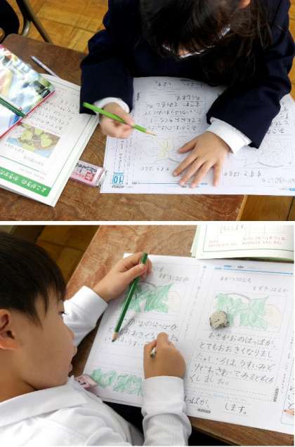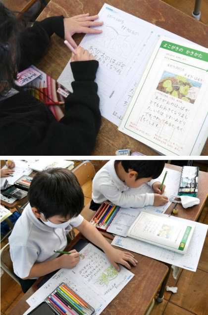1年生では、絵日記などを書くときの、よこ書きのかきかたを練習しています。とてもていねいに書いていますね。だいぶ、ひらがなを上手に書けるようになりましたね。
