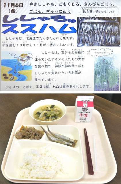 今日の献立は、焼きししゃも、五目汁、きんぴらごぼう、ごはん、牛乳でした。