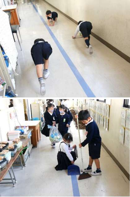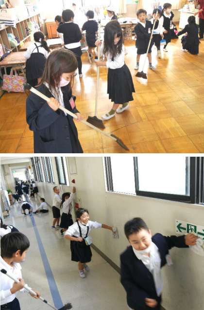 給食のあと、お昼休みが終わると、全員でお掃除をします。みんな一生懸命に自分の分担を頑張っていますね。
