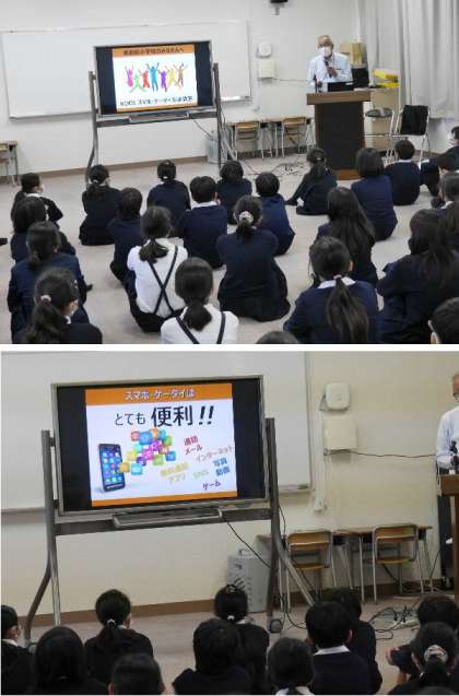 6年生では、KDDIの携帯会社の方に来ていただき、スマホ安全教室をお話しいただきました。