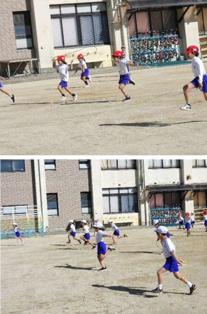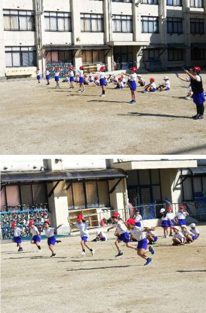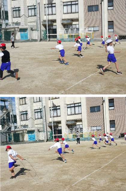 1年生が体育でなわとびの練習をしています。なわとびしながら走っているところです。少し寒くなってきました。しっかりからだを動かしてあたためていきましょう。なわとびはとてもいい運動になりますね。