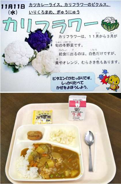 今日の献立は、カツカレーライス、カリフラワーのピクルス、いりくろ豆、牛乳でした。