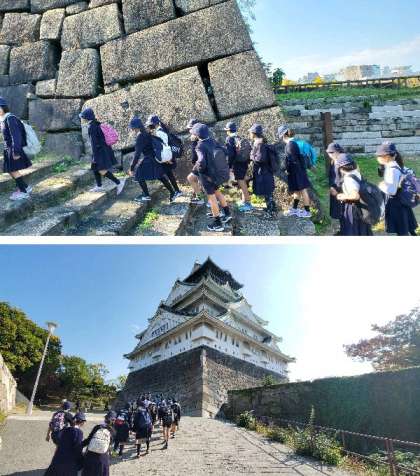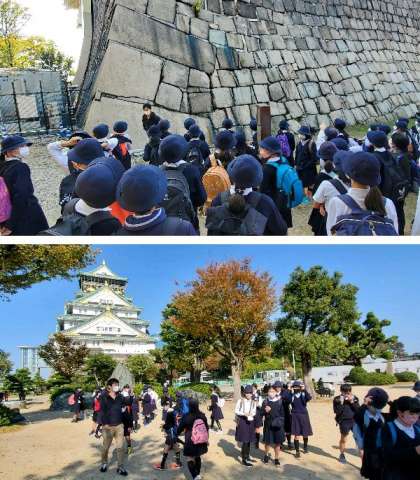 昼食をおえて、大阪城の砲弾の痕跡を見学しています。