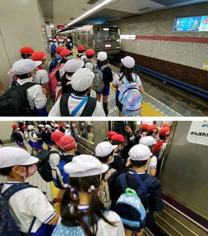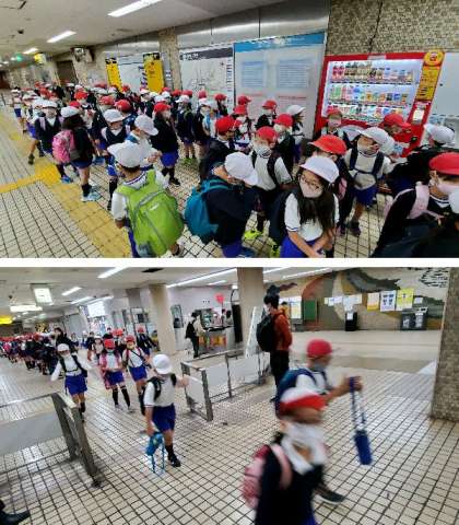3年が校外学習で服部緑地に出かけます。地下鉄に乗りました。