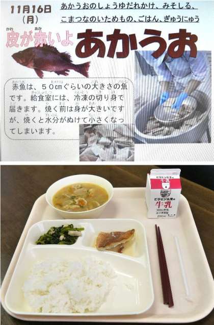 今日の献立は、赤魚の醤油だれかけ、みそ汁、小松菜の炒め物、ごはん、牛乳でした。お魚は骨がなかたので食べやすかったです。とてもおいしかったですね。