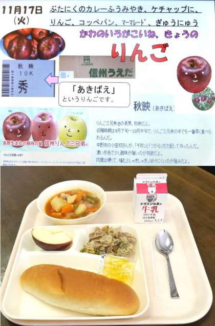 今日の献立は、豚肉のカレー風味焼き、ケチャップ煮、りんご(あきばえ)、コッペパン、マーマレード、牛乳でした。リンゴのおいしい季節ですね。