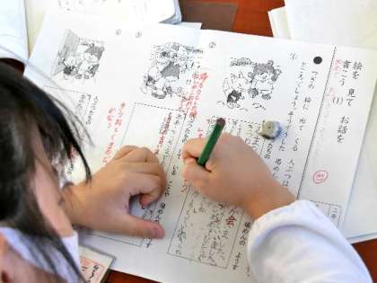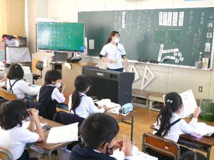 2年生の国語では、絵をみて、自分でお話しを作る学習をしています。文章と文章をつなぐ言葉などを学習しています。