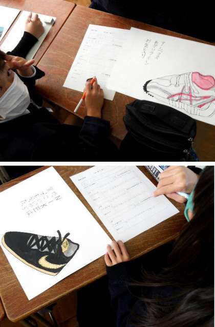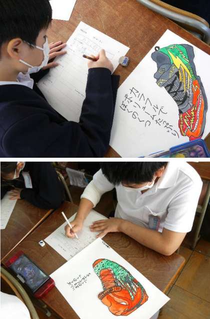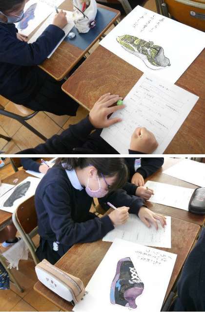 5年生では、自分が履いているくつを絵具で本物そっくりに描いています。「わたしのくつ」と題して、工夫したところや、ええところをアピールする文を書いています。わたしのくつの絵の横には、一言文章がそえられていて、ひきたてています。