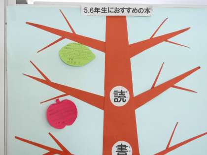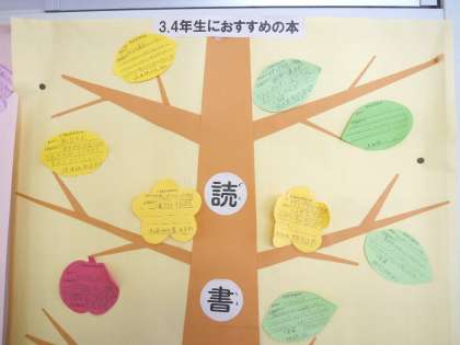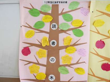 図書室の前に、低中高べつに「読書の木」がはられています。みんなから、おすすめの本が葉っぱに書かれて貼られています。