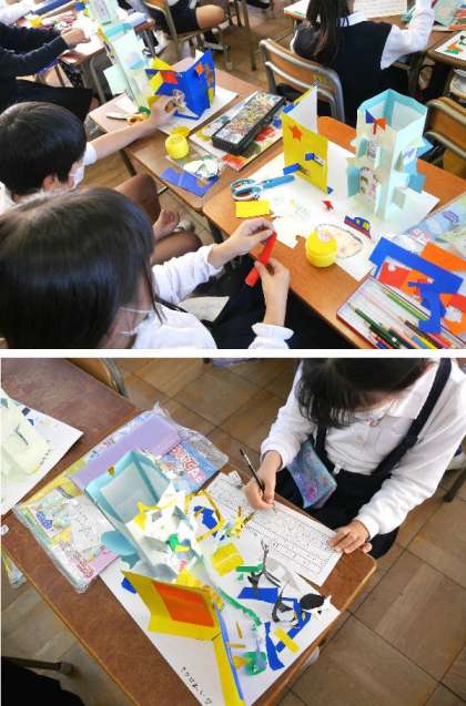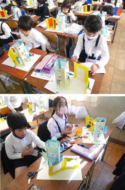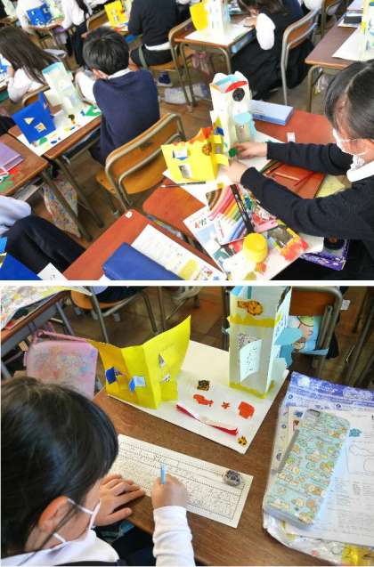 2年生では、窓がひらく建物を作ってきました。いよいよ完成です。自分の作った「まどをひらいて」の紹介文を書いて完成です。