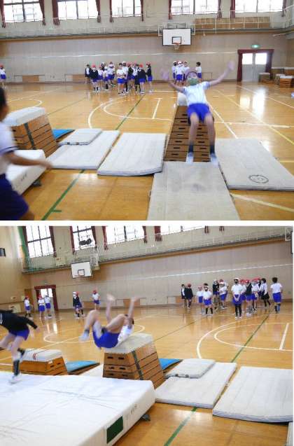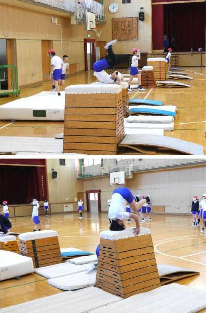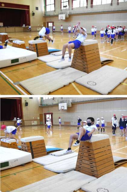 5年生のとび箱では、8段の上で前転をする高度な技の練習をしていました。さすが、5年生です。ポーズもきまっていました。