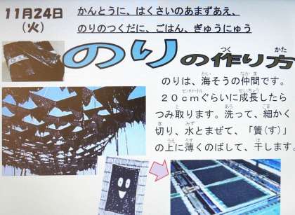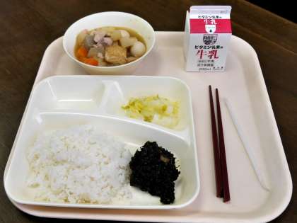 今日の献立は、関東煮、白菜の甘酢和え、のりの佃煮、ごはん、牛乳でした。のりがごはんにあいますね。
