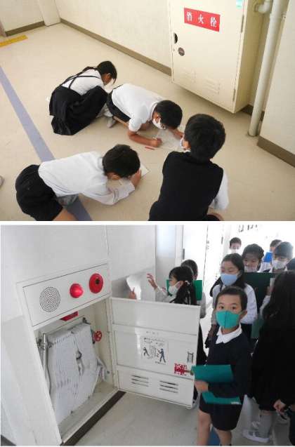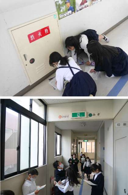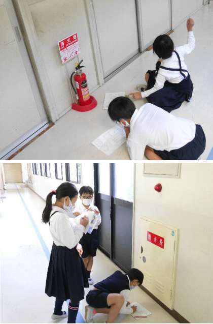 3年生が東都島小学校内の地図をもって、校内の設備について調べていました。消防栓や消火器がどこにあるかなどを、地図に印をつけていました。