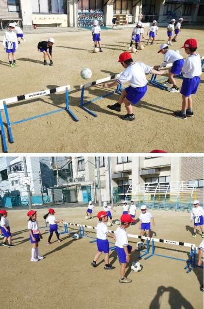 1年生がボールをける練習をしています。ハードルの中をじょうずにくぐるようにけっています。すぐ手が出ちゃってしまいます。足だけでボールをけるのはむずかしいね。